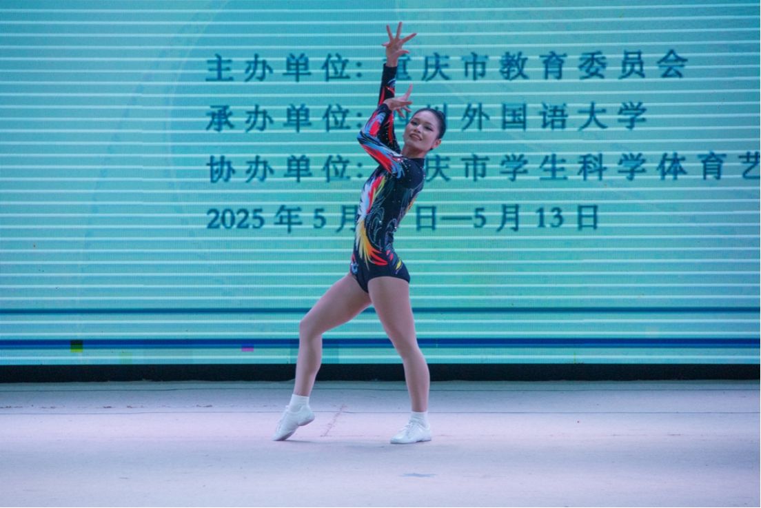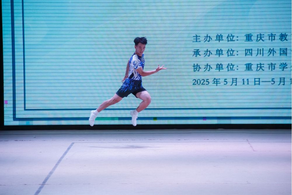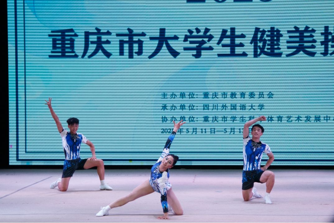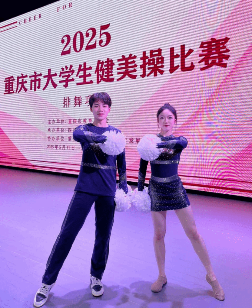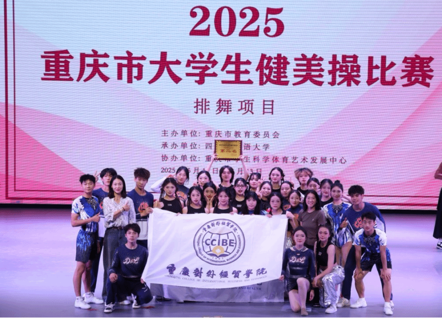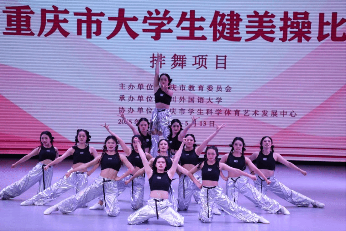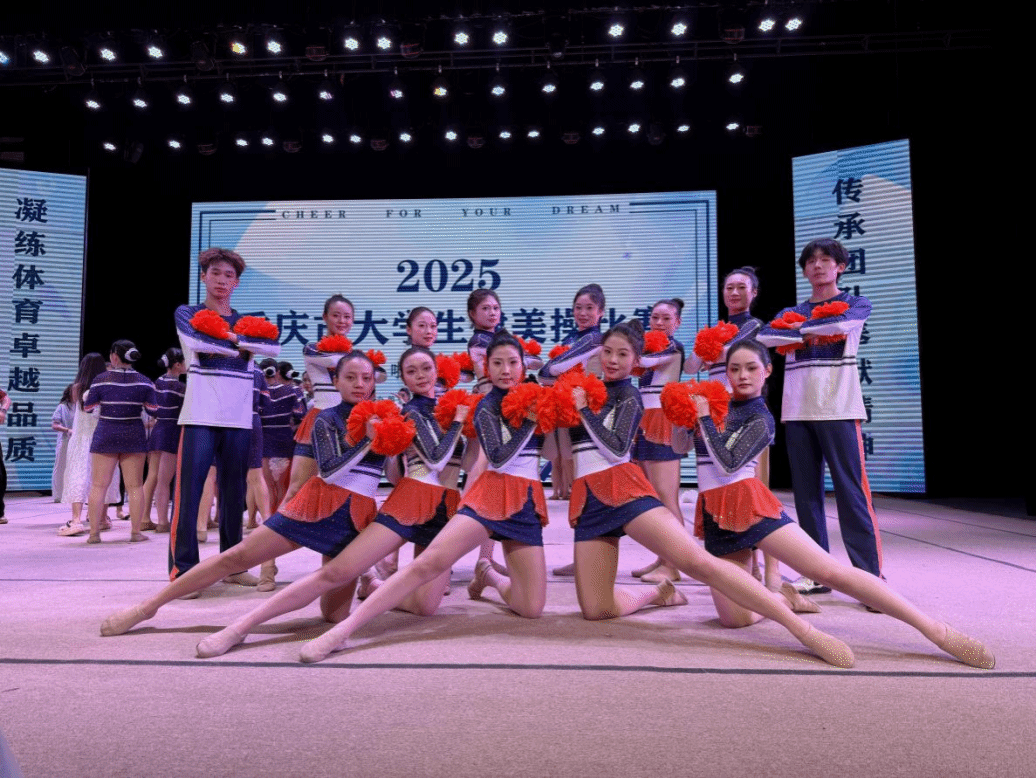 由重庆市教育委员会主办,四川外国语大学承办的2025年重庆大学生健美操比赛于2025年5月11—13日在四川外国语大学大礼堂举行。为了更好地提高整个的队伍的竞技水平,锻炼学生的舞台经验。在校体委的领导下,学校组成了由校体委主任李川校长为领队,体育与健康学院教师邓茗丹、向路为教练,由27名重庆对外经贸学院D&L啦啦操代表队的学生组成的队伍参加比赛。本次比赛分为甲、乙、丙三个组别,丙组为体育专业(高水平运动队学生、体育特长生、运动系学生等),学校代表队不仅有体育专业学生,还有普通院系的学生(影视融媒体学院,艺术设计学院学生)。