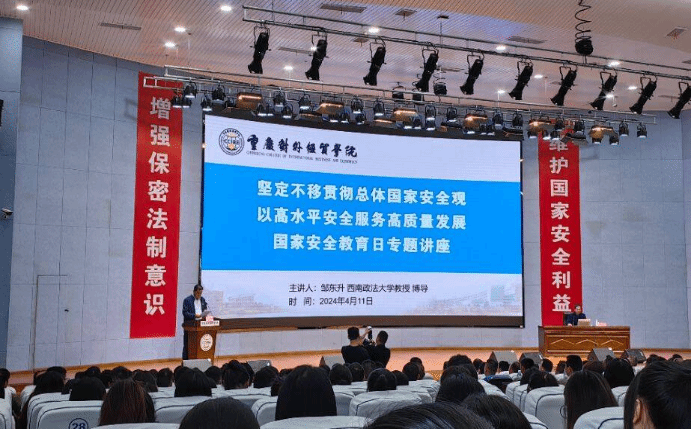 4. 4月11日,辅导员隆海琴带领体育学院5名学生参加了由西南政法大学教授在我校A区进行的“国家安全我有责,共筑国安长城”暨“大中小学同上国家安全课,共守安全三江城”国家安全教育日专题讲座。通过讲座提升师生国家安全意识和素养,坚定不移贯彻总体国家安全观,维护国家利益。