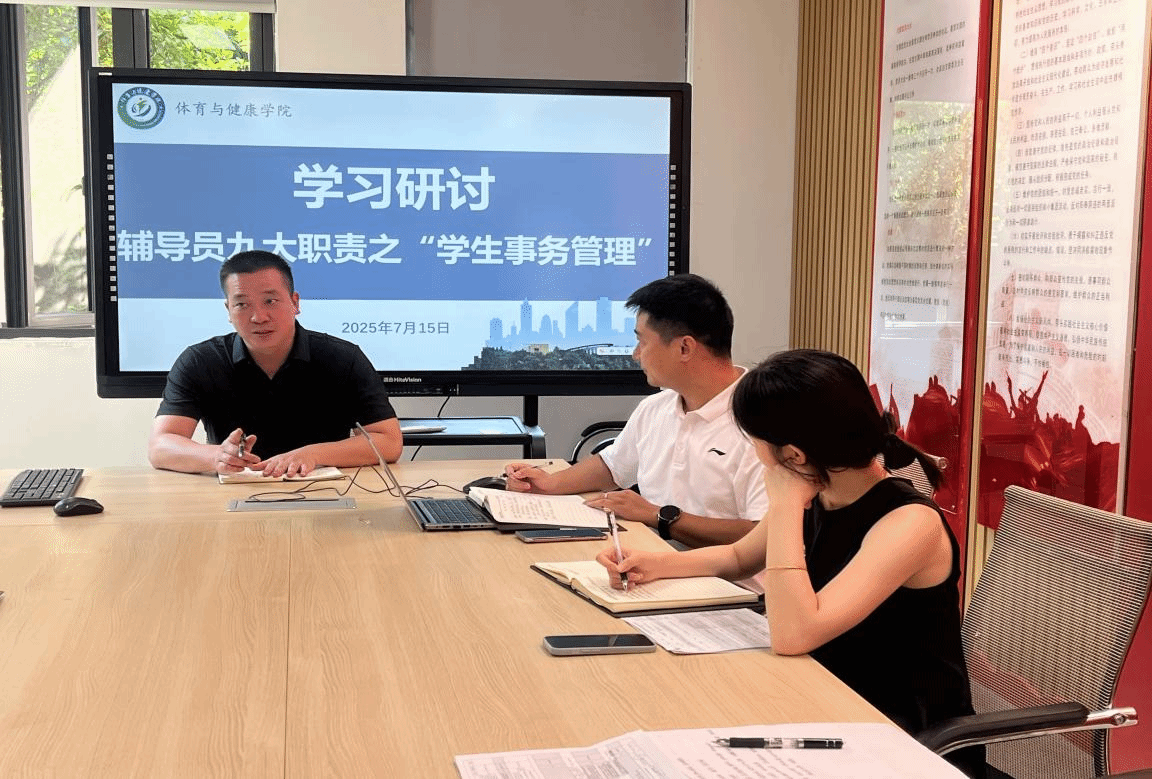 为深化辅导员素质能力提升训练营成果,将“学生日常事务管理” 专题培训的理念转化为实践动能,7 月 15 日,体育与健康学院在 B7110 会议室组织专题研讨与《学生手册》学习,党总支书记谢冬主持会议,全体辅导员结合张雪峰书记专题培训内容,围绕 “如何在日常事务中融入思想引领” 展开深度交流,凝聚 “管理有温度、服务有情怀” 的育人共识。