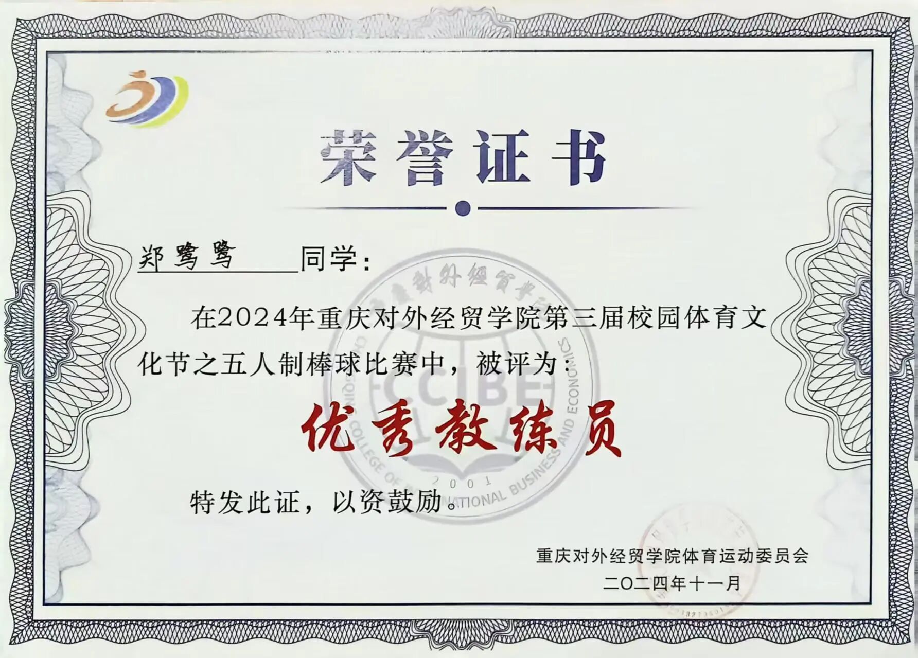 “路虽远,行则将至;事虽难,做则必成。”在今后的道路上,郑鹭鹭将继续以饱满的热情,带着学院老师、领导的谆谆教诲,勇敢地迎接未知挑战,在棒垒球领域持续深耕,进一步发扬自身的专业实践能力,为棒垒球事业贡献自己的一份贸院青春力量。