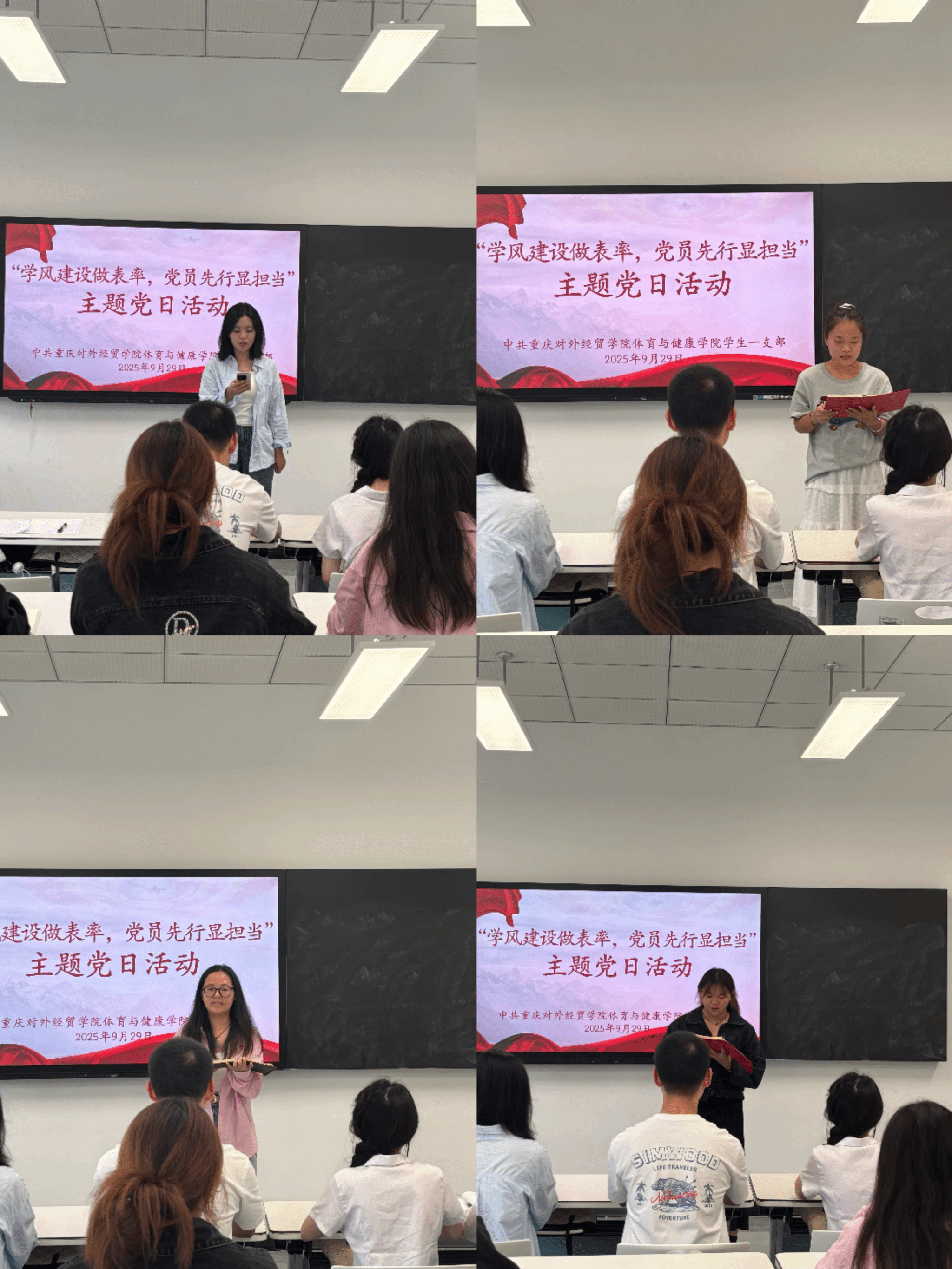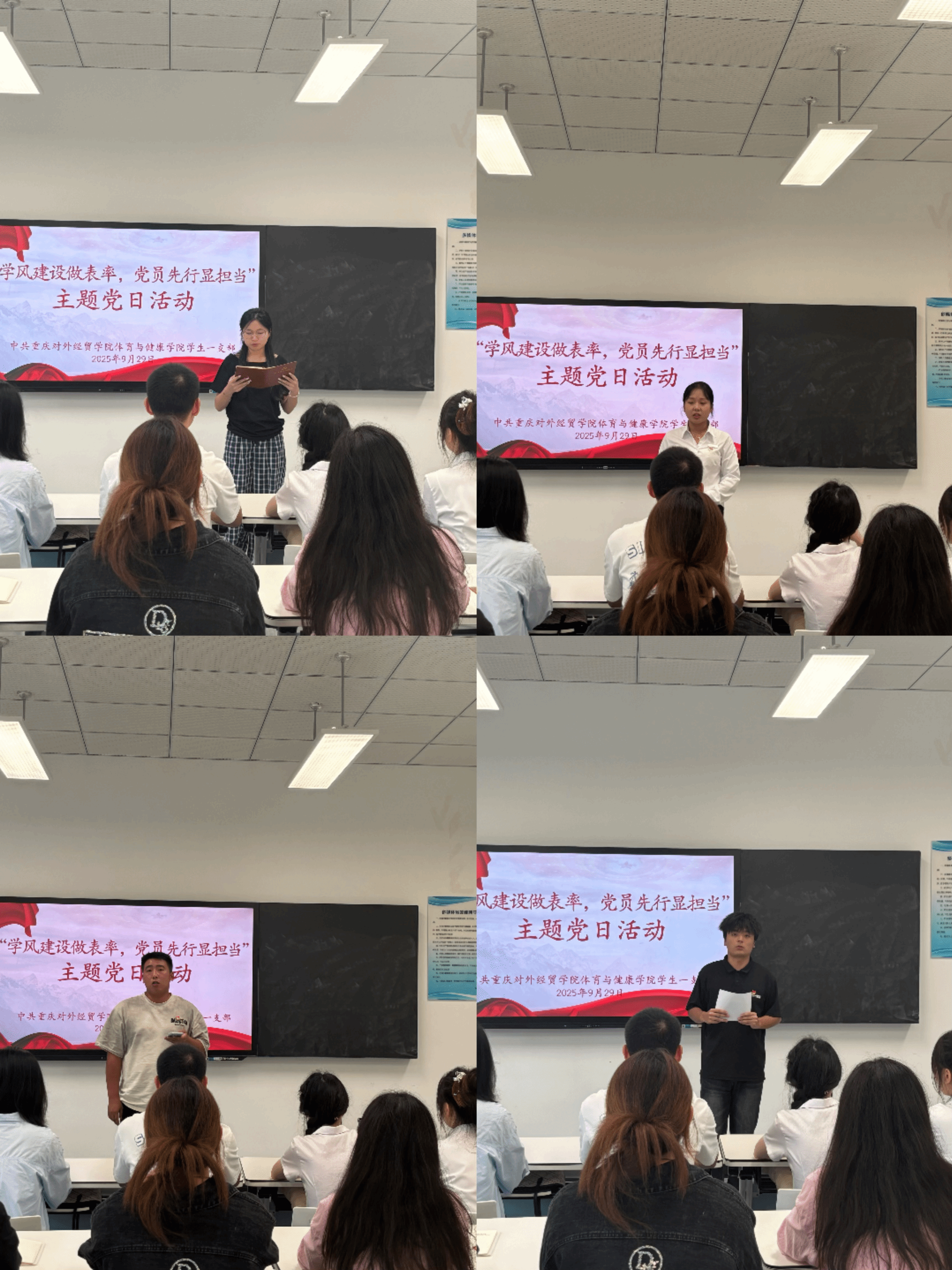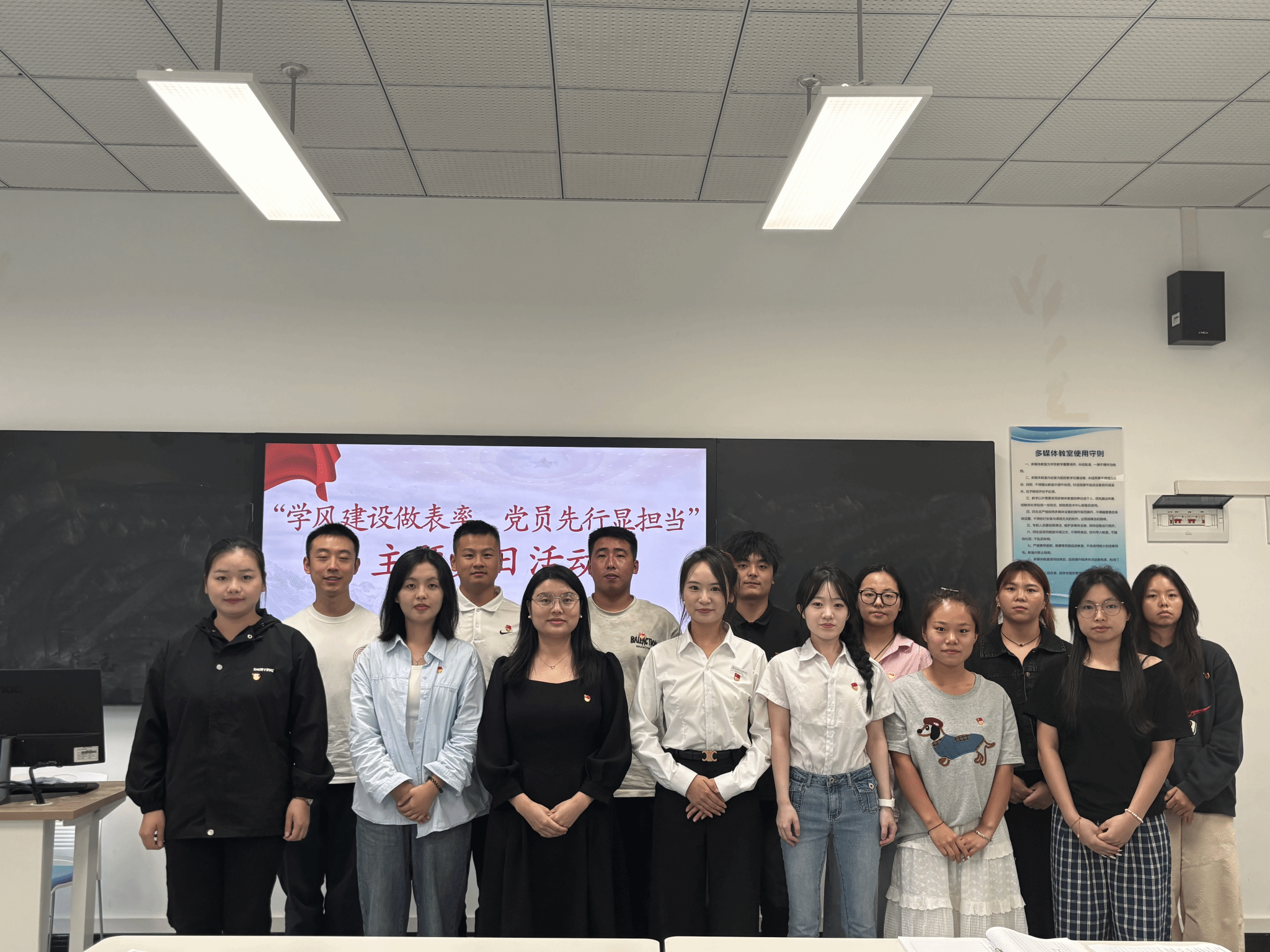为筑牢学风根基,彰显党员在本科教学工作合格评估中的先锋作用,2025年9月29日13:00,学生一支部在B7505召开了“学风建设做表率,党员先行显担当”主题党日活动。支部全体党员齐聚一堂,共同探讨党员在学风建设中的责任与路径,会议由支部书记何江梅老师主持,学生党员共计15人参加。