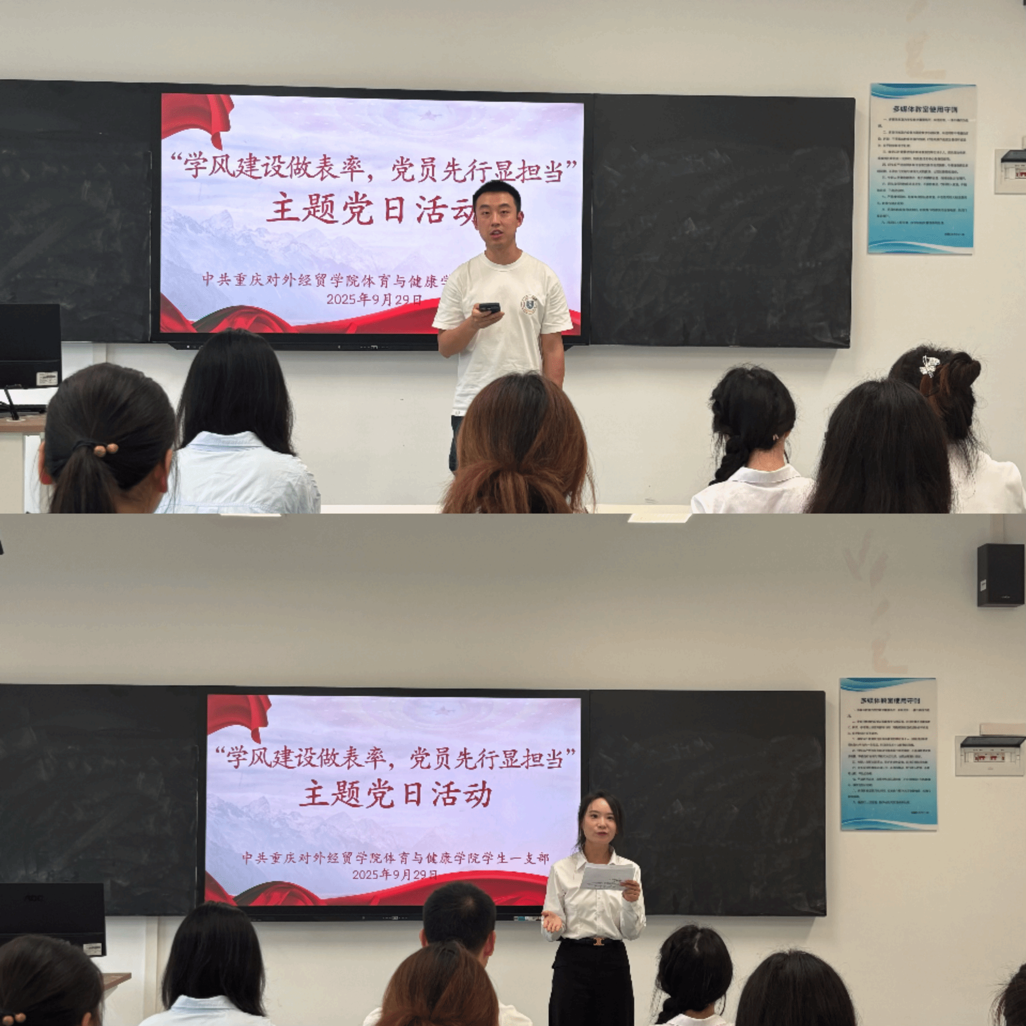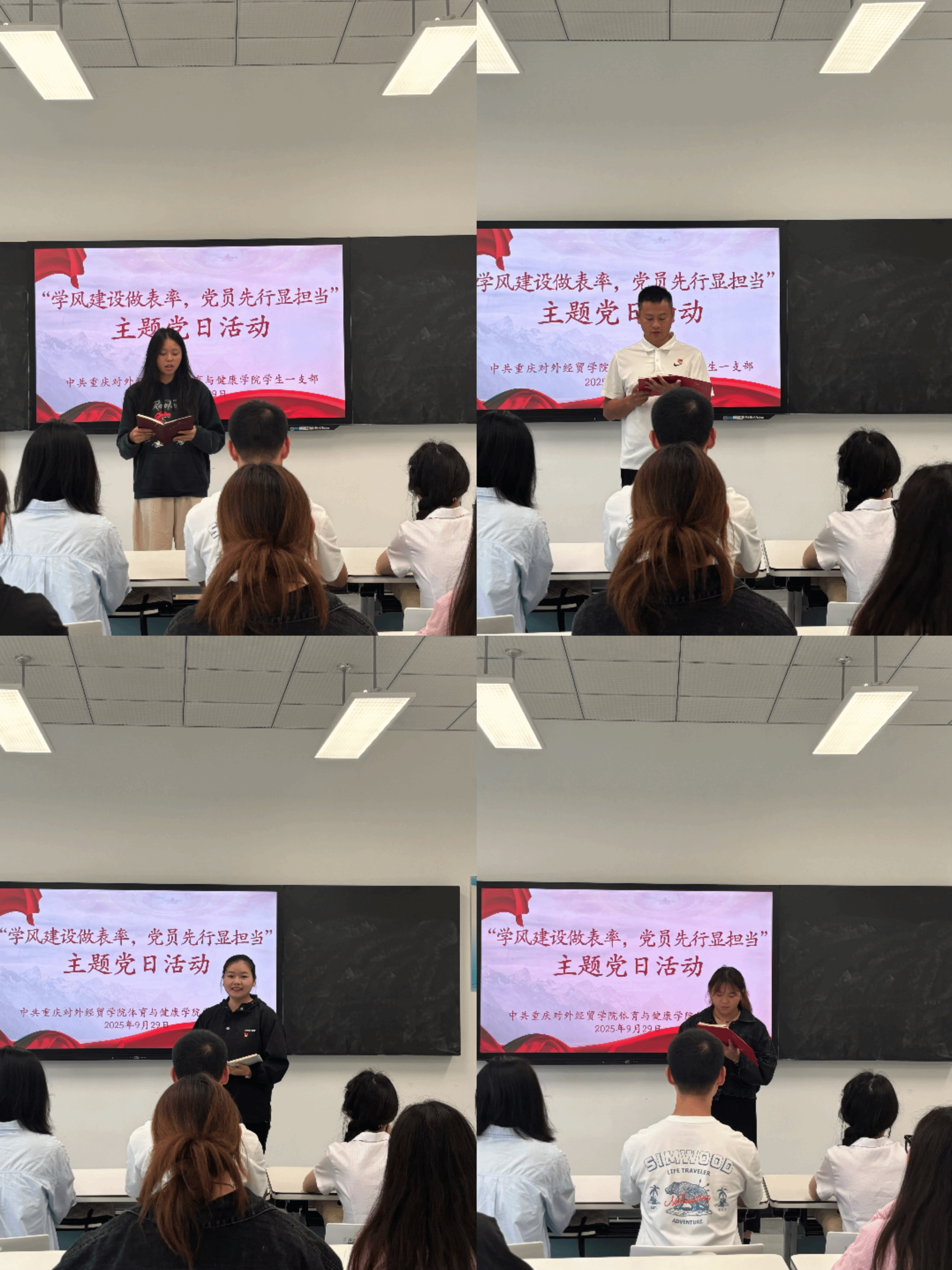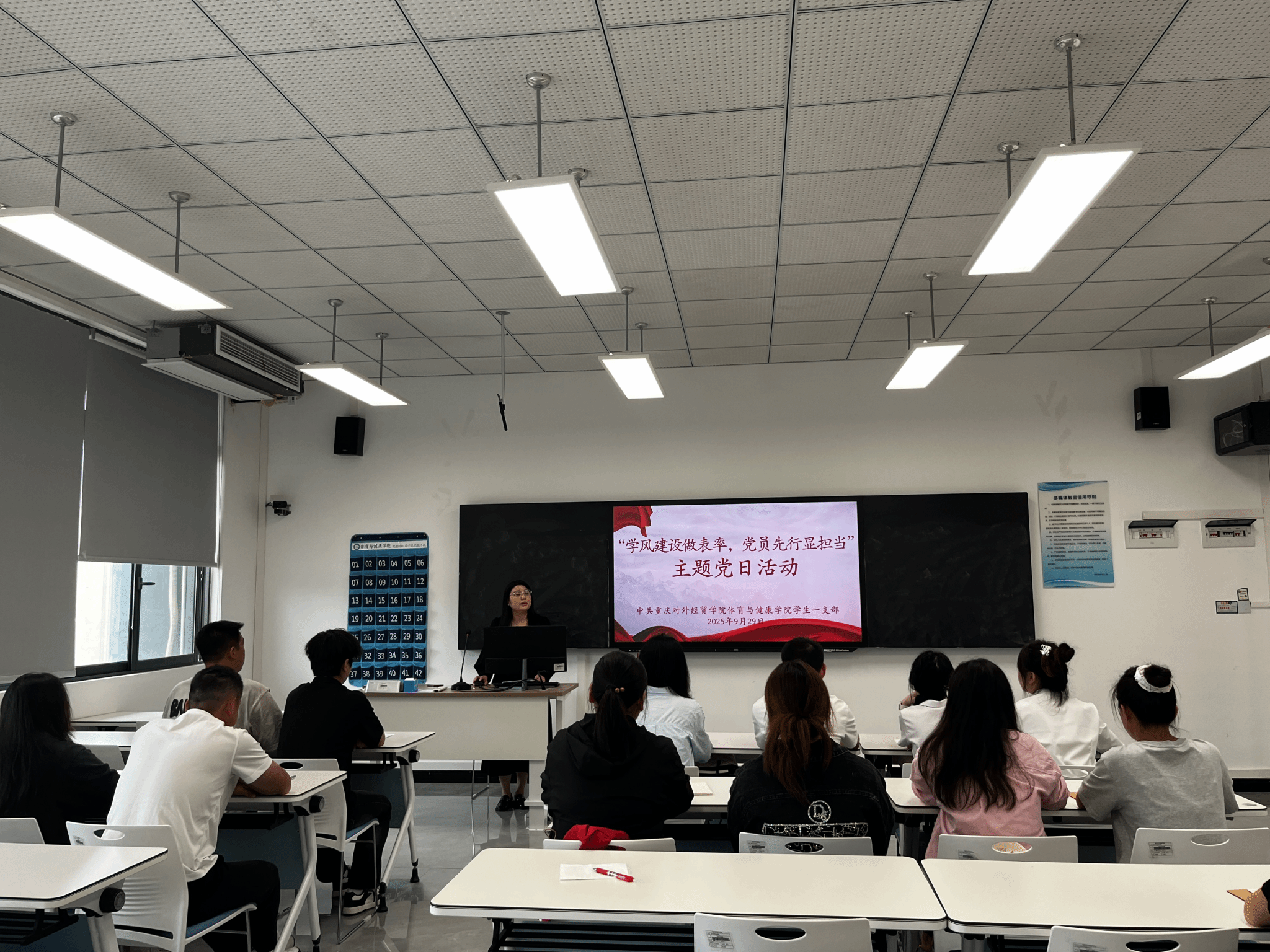 为筑牢学风根基,彰显党员在本科教学工作合格评估中的先锋作用,2025年9月29日13:00,学生一支部在B7505召开了“学风建设做表率,党员先行显担当”主题党日活动。支部全体党员齐聚一堂,共同探讨党员在学风建设中的责任与路径,会议由支部书记何江梅老师主持,学生党员共计15人参加。