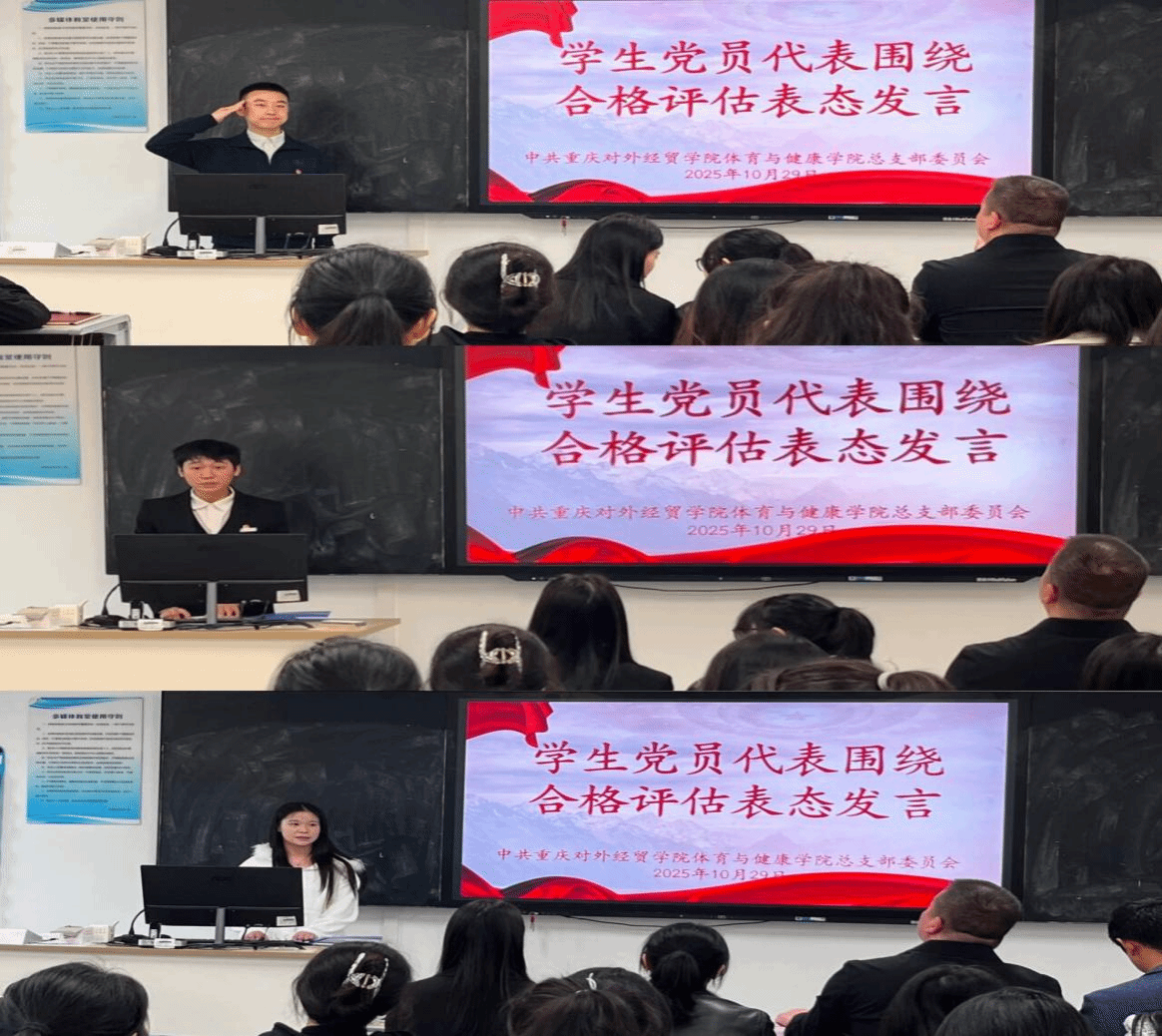 为深入贯彻落实学校关于本科教学工作合格评估的决策部署,充分发挥学生党支部的战斗堡垒作用和学生党员的先锋模范作用,2025年10月29日中午13:00,体育与健康学院学生第一、二、三党支部在B7304教室联合举行了“合格评估展风采,党员先行践初心”十月主题党日活动。本次活动由学生一支部书记何江梅主持,学院党总支书记谢冬、总支委员曾斯琪、刘云超,学生第一、二、三党支部书记及支部全体教师、学生党员出席活动,共计五十余人参加。