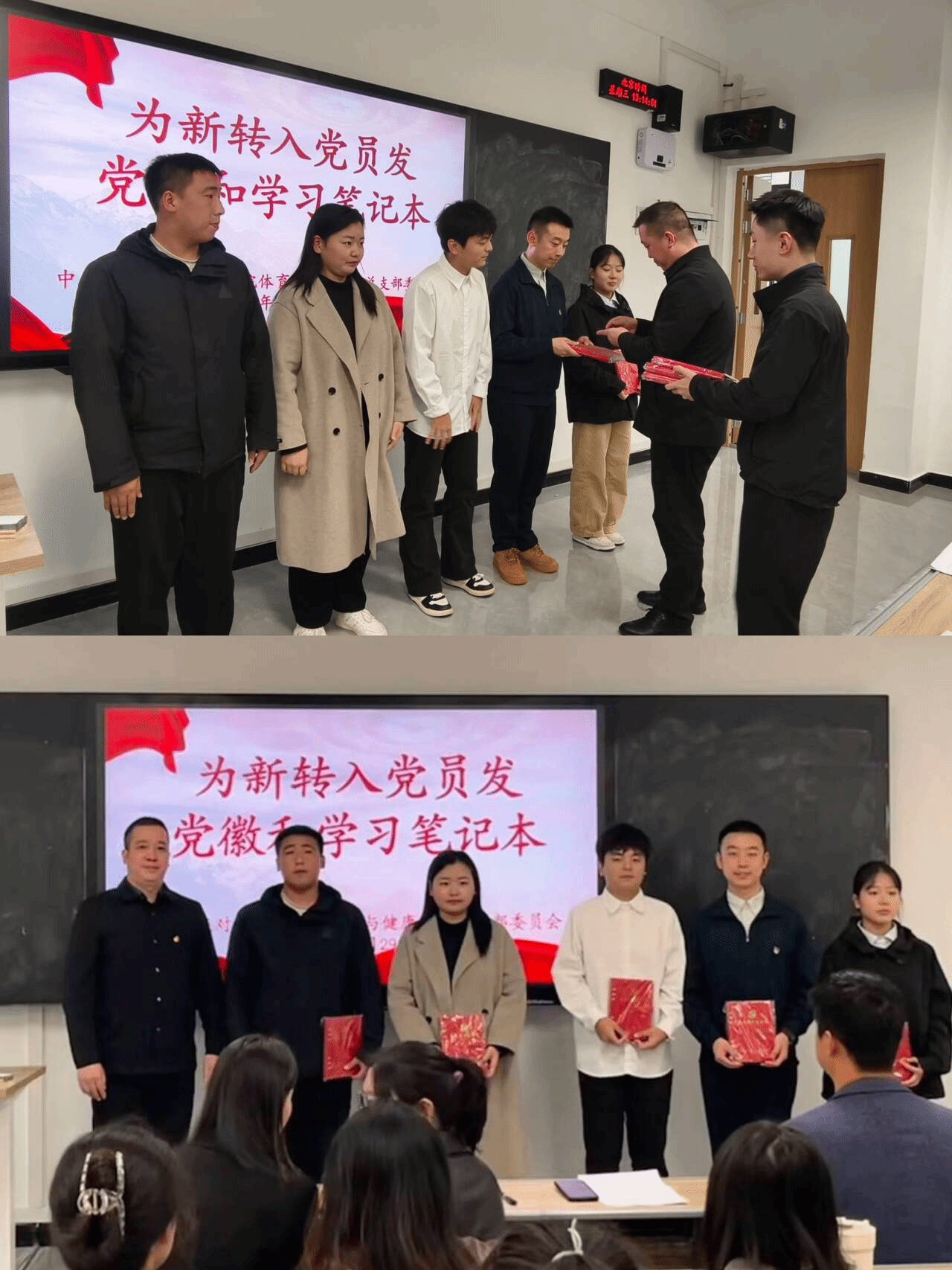 (图为谢冬书记为新转入党员发放党徽和笔记本)